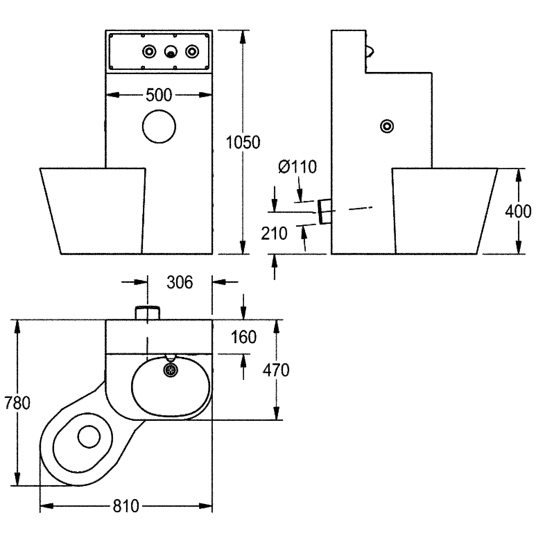 Chromium nickel steel toilet and sink combination unit, satin finish surface, for installing against a wall, with integrated electronic tap components. Invisible fixing with grub screws, lockable inspection opening Mounting stand, material thickness 2mm with elevated rear wall including wall outlet and tactile switch with start/stop function with seamless welded toilet paper roll compartment and seamless moulded wash basin with plastic trap. WC pan, material thickness 1.6mm with full-length skirting, arranged on the right 45 degrees, concealed bowl, tactile switch for WC flushing, flushing certified pursuant to EN 997, horizontal outlet at the back DN 100. With solenoid to connect to premixed hot water or cold water. Condensation water-proof concealed cistern with single flush technology (9 or 6 litres) Supply voltage 24 V DC Including fixing material.