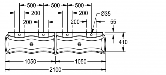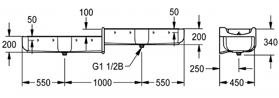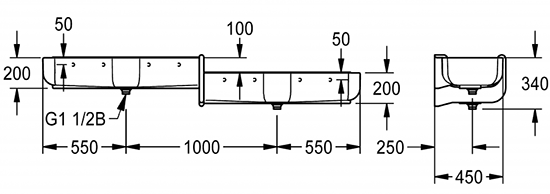 Each wash trough has a central waste and overflow valve DN 40x120mm, implemented as a standpipe, and is fitted with an integral back panel for fixing.